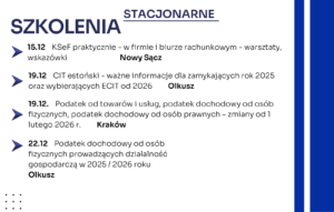 Link do zapisów: https://skwp.krakow.pl/terminy-szkolen/podatek-dochodowy-od-osob-fizycznych-prowadzacych-dzialalnosc-gospodarcza-w-2025-2026-roku-olkusz-22-12-2025/